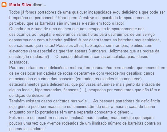 O meu comentário sobre a questão : "Da sua experiência pessoal e/ou profissional de contacto com crianças, jovens ou adultos com incapacidade e/ou deficiência que barreiras lhe parecem mais evidentes persistirem?", pode ser consultado se seguirem o link disponível e/ou no menu "Fórum" deste e-portfólio.