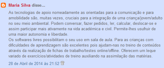 O meu comentário sobre a questão: " Da sua experiência pessoal ou profissional pode relatar que tipo de tecnologias viu usar por aluno com necessidades especiais ou pessoa com deficiência que contribuíssem de forma decisiva para a respetiva participação e atividade?", que pode ser consultado se seguirem o link disponível e/ou no menu "Fórum" deste e-portfólio.